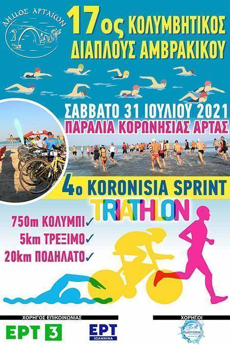 Ο λόγος για τον «17o Κολυμβητικό Διάπλου Αμβρακικού» και το «4ο Koronisia Sprint Triathlon». Ο φετινός Κολυμβητικός Διάπλους του Αμβρακικού είναι αφιερωμένος στην μνήμη του Φώτη Ζήση, ο οποίος διετέλεσε Διευθυντής των ΕΠΑΣ μαθητείας ΟΑΕΔ. Αγωνιστικό Πρόγραμμα: 4 Στις 7 το πρωί, ξεκινά ο Κολυμβητικός Διάπλους από το λιμάνι της Βόνιτσας. 4 Στις 8:30 ξεκινά από την παραλία της Κορωνησίας το 4ο Koronisia Sprint Triathlon (750μ κολύμβηση, 20χλμ ποδήλατο, 5χλμ τρέξιμο).