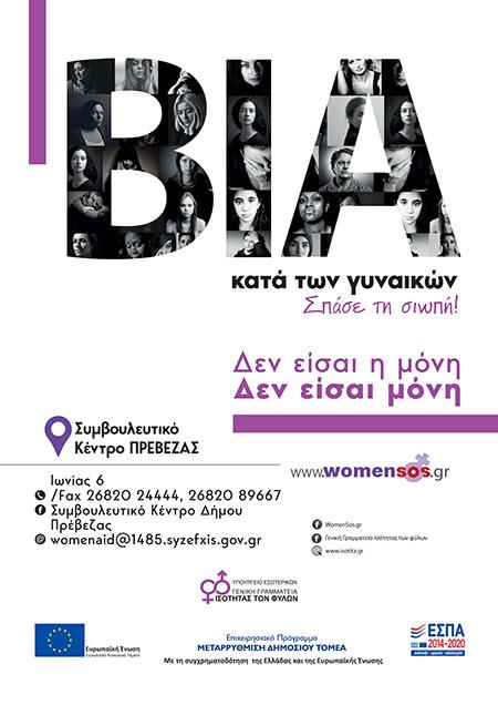Το Συμβουλευτικό Κέντρο Γυναικών Δήμου Πρέβεζας απευθύνεται στις γυναίκες που υποφέρουν σιωπηλά και τις προτρέπει να μιλήσουν, ώστε το επιστημονικό του προσωπικό να τους παρέχει δωρεάν υποστηρικτικές υπηρεσίες όπως ψυχοκοινωνική στήριξη, εργασιακή συμβουλευτική, νομική συμβουλευτική, υπηρεσίες παραπομπής και πληροφόρησης. Σκοπός των υπηρεσιών αυτών είναι η ενδυνάμωση των γυναικών και η επανάκτηση της αυτοεκτίμησης τους, ώστε να αναλάβουν την ευθύνη της προσωπικής, οικογενειακής και επαγγελματικής τους ζωής.