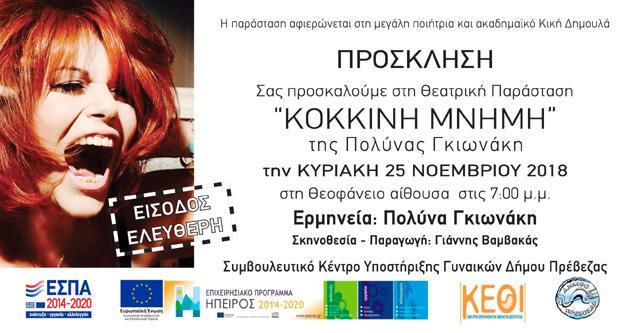 Το Κέντρο Συμβουλευτικής Γυναικών του Δήμου Πρέβεζας τιμά και φέτος την 25η Νοεμβρίου, με την θεατρική παράσταση «ΚΟΚΚΙΝΗ ΜΝΗΜΗ», της Πολύνας Γκιωνάκη. Ένα αυτοβιογραφικό έργο που μας αφορά όλους και στέλνει μήνυμα να σπάσει η σιωπή, γιατί η βία είναι έγκλημα. Η παράσταση αφιερώνεται στην μεγάλη ποιήτρια και ακαδημαϊκό Κική Δημουλά, που συμμετέχει με την φωνή της, αφού θα ακουστεί ηχογραφημένη απαγγελία της ποίησης της.