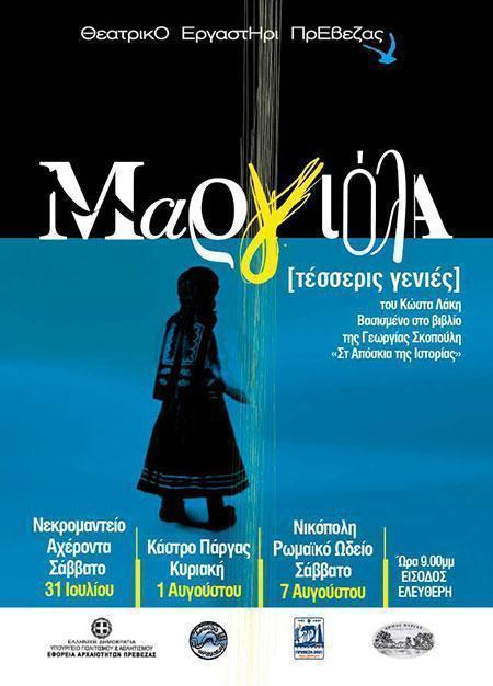 Το Θεατρικό Εργαστήρι Πρέβεζας σε συνεργασία με τον Δήμο Πρέβεζας, την Εφορεία Αρχαιοτήτων Πρέβεζας, την Πρέβεζα 2021 και τον Δήμο Πάργας παρουσιάζει την παράσταση : “Μαργιόλα- Τέσσερις Γενιές”