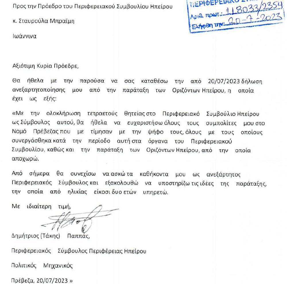 Την ανεξαρτητοποίησή του από την παράταξη "Ορίζοντες Ηπείρου" κατέθεσε ο Περιφερειακός Σύμβουλος Π.Ε. Πρέβεζας Δημήτρης Παππάς.