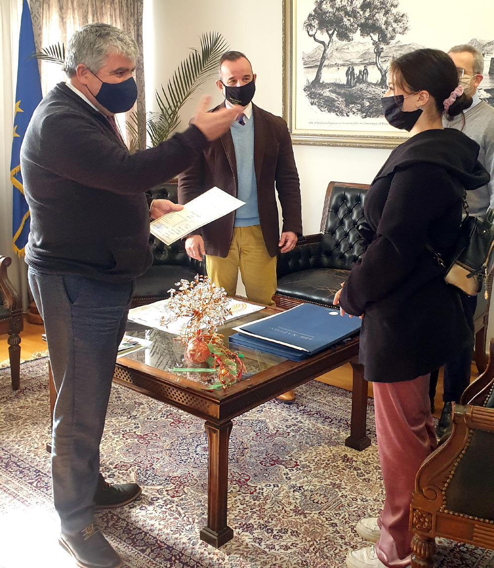 Εν μέσω πανδημίας και τηρώντας πιστά όλα τα μέτρα προστασίας και υγιεινής, σε μια λιτή αλλά γεμάτη χαρά και αισιοδοξία τελετή που πραγματοποιήθηκε πρόσφατα , ο Δήμαρχος Πρέβεζας Νίκος Γεωργάκος απένειμε τον επίσημο κρατικό τίτλο σπουδών πτυχίο πιάνου με βαθμό άριστα, στη Μαγδαληνή Βερυκίου, περσινή απόφοιτη του Δημοτικού Ωδείου Πρέβεζας «Σπύρος Δήμας». Στην εκδήλωση παρέστησαν ο Αντιπρόεδρος της Οικονομικής Επιτροπής του Δήμου και εντεταλμένος Δημοτικός Σύμβουλος για το Δημοτικό Ωδείο Πρέβεζας κ. Λεωνίδας Αργυρός και ο Διευθυντής του Δημοτικού Ωδείου Πρέβεζας κ. Γιώργος Χλίτσιος, οι οποίοι ενημέρωσαν τον Δήμαρχο σχετικά με την πορεία του Ωδείου.