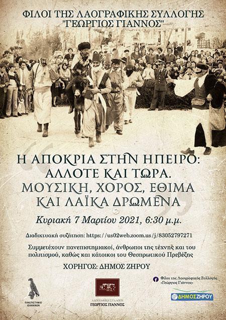Με μεγάλη χαρά σας προσκαλούμε στη διαδικτυακή στρογγυλή τράπεζα «Η αποκριά στην Ήπειρο: άλλοτε και τώρα, μουσική, χορός, έθιμα και λαϊκά δρώμενα» που διοργανώνουν οι Φίλοι της Λαογραφικής Συλλογής «Γεώργιος Γιάννος» την Κυριακή 7 Μαρτίου 2021 και ώρα 18¨30, με τη στήριξη του Πανεπιστημίου Ιωαννίνων και την υποστήριξη του Δήμου Ζηρού.