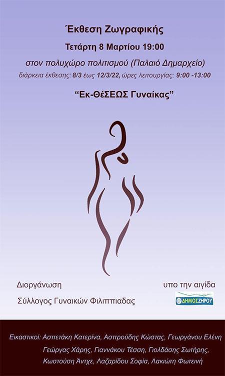H Παγκόσμια Ημέρα της Γυναίκας έχει καθιερωθεί η 8η Μαρτίου και ο Σύλλογος Γυναικών Φιλιππιάδας, διοργανώνει μία ξεχωριστή εικαστική έκθεση- με τίτλο: 'Εκ-ΘέΣΕΩΣ Γυναίκας'.
