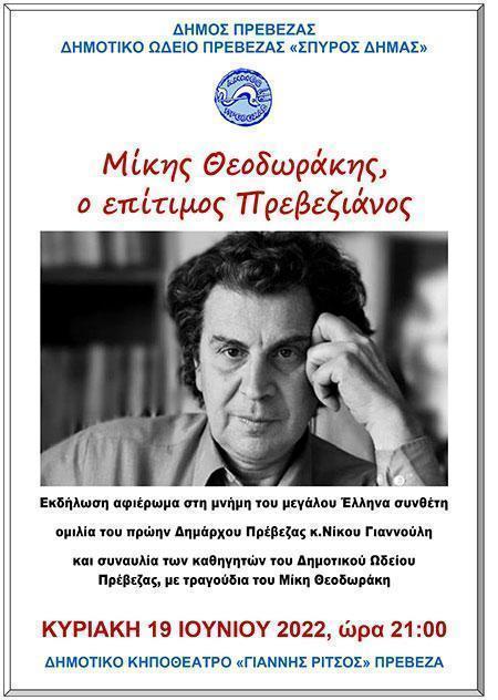 Το Δημοτικό Ωδείο Πρέβεζας «Σπύρος Δήμας», τιμώντας τη μνήμη του σπουδαίου Έλληνα συνθέτη και επίτιμου δημότη Πρέβεζας, Μίκη Θεοδωράκη, διοργανώνει εκδήλωση την Κυριακή 19 Ιουνίου, ώρα 9 μ.μ. στο Δημοτικό Κηποθέατρο «Γιάννης Ρίτσος», με τίτλο: «Μίκης Θεοδωράκης, ο επίτιμος Πρεβεζιάνος».