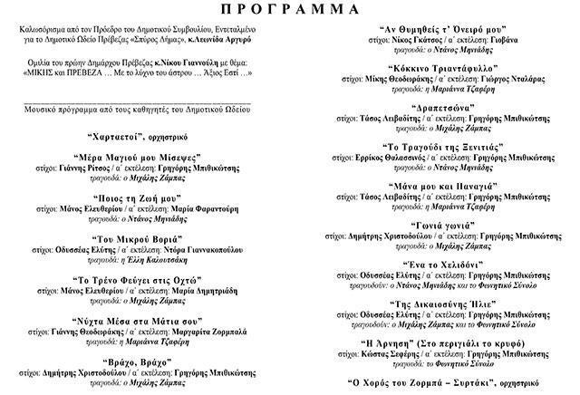 Με ομιλία θα ξεκινήσει η εκδήλωση και θέμα: «ΜΙΚΗΣ και ΠΡΕΒΕΖΑ … Με το λύχνο του άστρου … Άξιος Εστί …» από τον πρώην Δήμαρχο Πρέβεζας κ.Νίκο Γιαννούλη, στη θητεία του οποίου ανακηρύχθηκε ο Μίκης Θεοδωράκης επίτι-μος δημότης Πρέβεζας (1985). Θα ακολουθήσει συναυλία με πολυμελή ορχήστρα και φωνητικό σύνολο των καθηγητών του Δημοτικού Ωδείου Πρέβεζας «Σπύρος Δήμας», οι οποίοι θα ερμηνεύσουν γνωστά και αγαπημένα τραγούδια του Μίκη Θεοδωράκη.