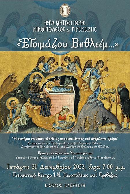 Ἡ Ἱερά Μητρόπολη Νικοπόλεως καί Πρεβέζης ἐν ἀναμονῇ τῶν ἁγίων ἡμερῶν τοῦ Δωδεκαημέρου διοργανώνει ἑόρτια χριστουγεννιάτικη ἐκδήλωση τήν Τετάρτη 21 Δεκεμβρίου 2022 καί ὥρα 7:00 μ.μ στό Πνευματικό Κέντρο τῆς Ἱερᾶς Μητροπόλεώς μας. Ἡ ἐκδήλωση θά περιλαμβάνει ἐπίκαιρη ὁμιλία τοῦ Θεολόγου - Συγγραφέα κ. Ἐμμανουήλ Μελινοῦ, Διευθυντοῦ τῆς Βιβλιοθήκης τῆς Ἱερᾶς Συνόδου τῆς Ἐκκλησίας τῆς Ἑλλάδος μέ θέμα: «Ἡ σωτήρια ἐπέμβαση τῆς θείας προσωπικότητος στό ἀνθρώπινο δράμα», καί προεορτίους ὕμνους τῶν Χριστουγέννων πού θά ἑρμηνεύσει ὁ Χορός Ψαλτῶν τῆς Ἱερᾶς Μητροπόλεως Νικοπόλεως καί Πρεβέζης «Chorus Nicopolitanus» μέ Χοράρχη τόν κ. Μιχαήλ Ζάμπα.