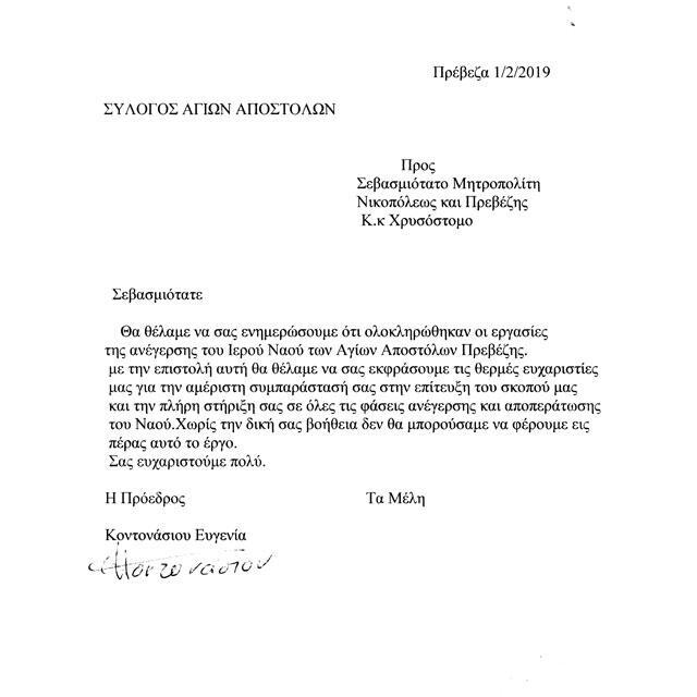 Τον Σεβασμιώτατο Μητροπολίτη μας επεσκέφθησαν σήμερα Παρασκευή 17-5-2019 και ώρα 11.00 π.μ. στα Γραφεία της Ιεράς Μητροπόλεως μέλη του Συλλόγου Αγίων Αποστόλων Πρέβεζας και του επέδωσαν επιστολή με την οποία του εκφράζουν θερμές ευχαριστίες για την βοήθεια, την στήριξη και συμπαράσταση του καθ’ όλη την διάρκεια των εργασιών ανεγέρσεως και αποπερατώσεως του ιερού παρεκκλησίου Αγίων Αποστόλων περιοχής Αγ. Θωμά Πρεβέζης. Ο Σεβασμιώτατος συνεχάρη τα μέλη της Επιτροπής για την ανιδιοτελή προσφορά τους και τους ευχαρίστησε για την εν γένει βοήθεια στο έργο της Εκκλησίας, ευχόμενος υγεία και πλούσια την ευλογία του Χριστού στη ζωή τους.
