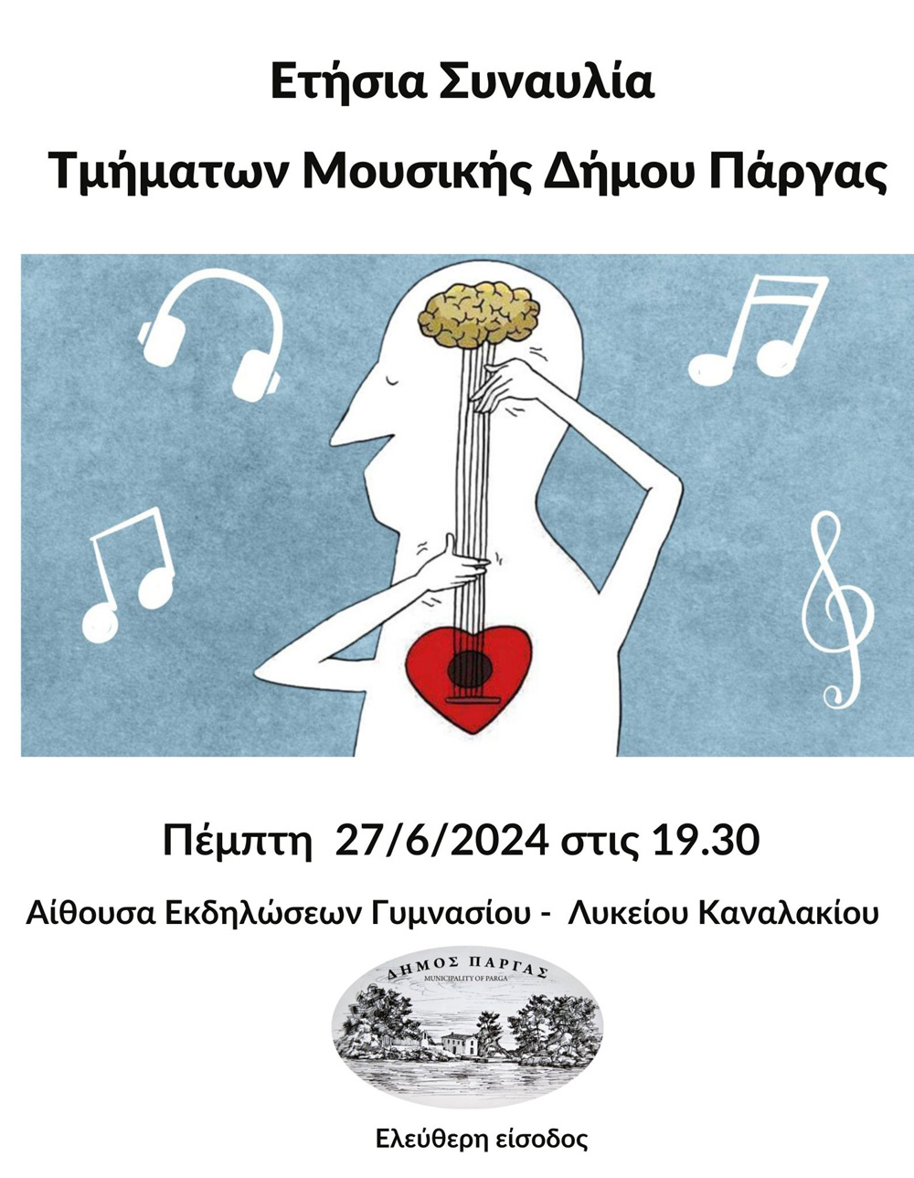 Ο Δήμος Πάργας στα πλαίσια της προσπάθειας για την ενίσχυση της Μουσικής Παιδείας με δωρεάν μαθήματα Πιάνου-Κιθάρας-Πνευστών Οργάνων-Φιλαρμονικής- Χορωδίας και την ολοκλήρωση του τρίτου έτους λειτουργίας των Μουσικών Τμημάτων του Δήμου Πάργας, σας καλούμε να απολαύσετε τη συναυλία των μουσικών μας, ήμερα Πέμπτη 27 Ιουνίου και ώρα 19:30 στην Αίθουσα εκδηλώσεων Γυμνασίου- Λυκείου Καναλακίου.