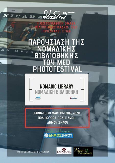 Η Νομαδική Βιβλιοθήκη είναι μια πολύ σημαντική δράση του Μεσογειακού Φεστιβάλ Φωτογραφίας (MedPhoto Festival), κατά την οποία μια ολοένα και αυξανόμενη συλλογή φωτογραφικών βιβλίων ταξιδεύει ανά την Ελλάδα και παραμένει σε κάθε τόπο τέσσερις μήνες, ώστε άνθρωποι, φορείς, πανεπιστημιακά ιδρύματα και συλλογικότητες εκτός Αθήνας να μπορούν να έρθουν σε επαφή με σημαντικά έργα της Φωτογραφίας. Ο Πολυχώρος Πολιτισμού του δήμου Ζηρού και η Φωτογραφική Ομάδα Φιλιππιάδας ΚΑ.ΔΡΩ είναι ο 4ος σταθμός της Νομαδικής Βιβλιοθήκης μετά την Βιβλιοθήκη του Πανεπιστημίου Αιγαίου στο Παράρτημα Σάμου, την Δημόσια Κεντρική Βιβλιοθήκη Ρεθύμνου και την Δημόσια Κεντρική Βιβλιοθήκη Βέροιας.