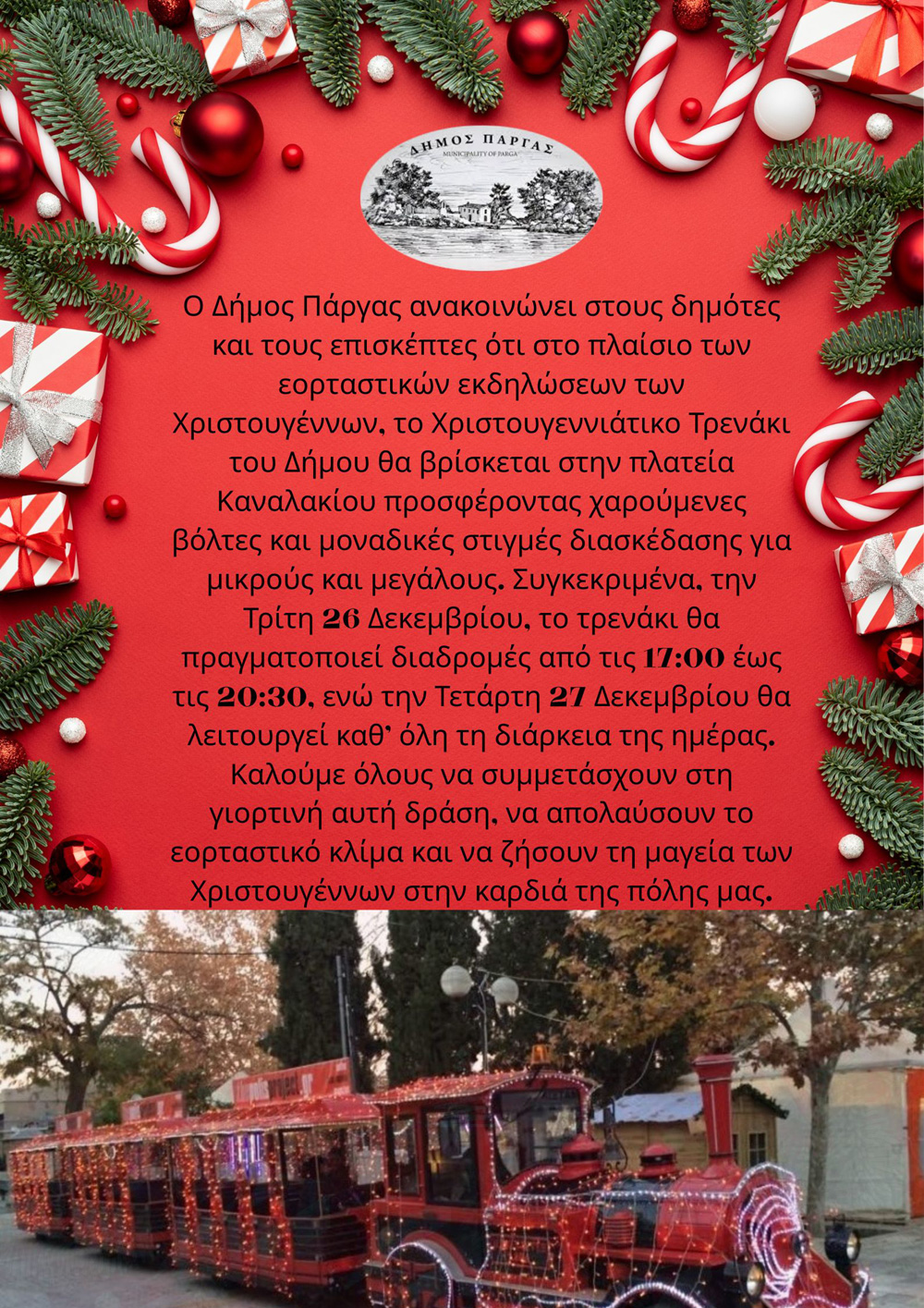 Ο Δήμος Πάργας ανακοινώνει στους δημότες και τους επισκέπτες ότι στο πλαίσιο των εορταστικών εκδηλώσεων των Χριστουγέννων, το Χριστουγεννιάτικο Τρενάκι του Δήμου θα βρίσκεται στην πλατεία Καναλακίου προσφέροντας χαρούμενες βόλτες και μοναδικές στιγμές διασκέδασης για μικρούς και μεγάλους.