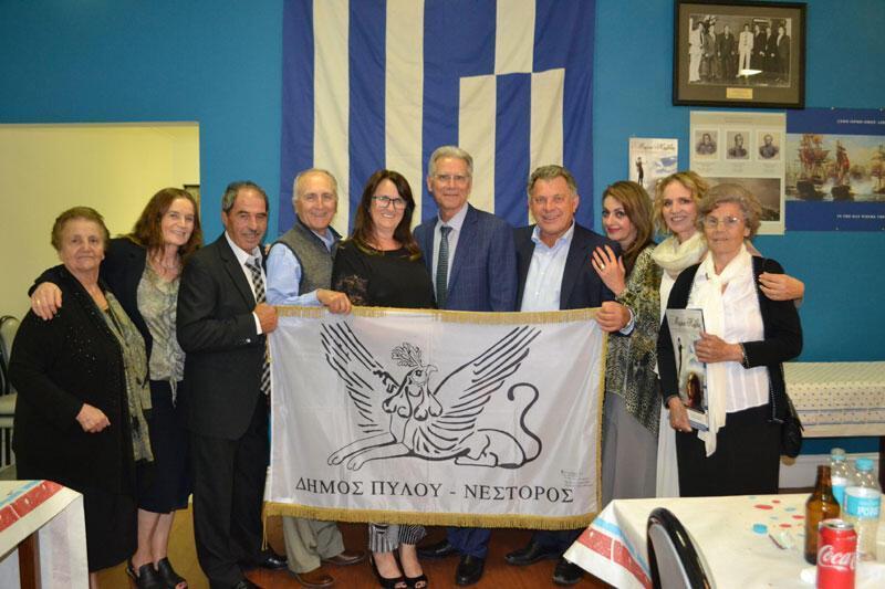 Στη συνέχεια ο Γραμματέας της Μεσσηνιακής Αμφικτυονίας Παναγιώτης Μπαζίγος μίλησε για το διεθνή ρόλο της Αμφικτυονίας μεταφέροντας και τους χαιρετισμούς την ηγεσίας της. Η ομάδα παρέδωσε μια σημαία του Δήμου Καλαμάτας και μία του Δήμου Πύλου. Ακόμα δόθηκαν μεταξωτά Καλαματιανά μαντίλια στον πρόεδρο κ. Παρασκευά Σωτηρόπουλο και τα μέλη του Διοικητικού Συμβούλιου του.