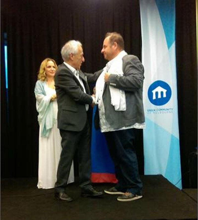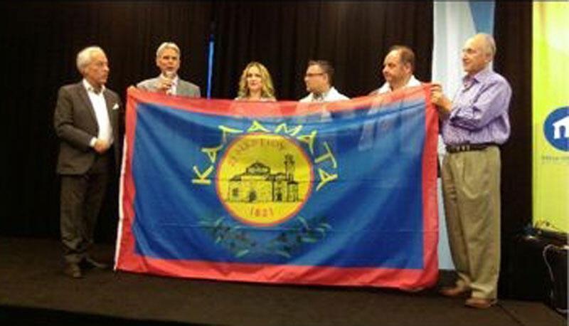 Στη συνέχεια ο Παναγιώτης Μπαζίγος μεταφέρνοντας τους χαιρετισμούς της Προέδρου της Μεσσηνιακής Αμφικτυονίας κ. Ελένη Αλειφέρη, και του Συμπροέδρου κ. Δημητρίου Καφαντάρη παρέδωσε μία ιστορική σημαία του Δήμου Καλαμάτας μαζί με τους χαιρετισμούς του Δημάρχου κ. Παναγιώτη Νικά, στον Πρόεδρο την Παμμεσσηνιακής Ομοσπονδίας Ωκεανίας κ. Παναγιώτη Ανδρινόπουλο με σκοπό η σημαία αυτή να χρησιμοποιείται από όλους τους Μεσσηνιακούς Συλλόγους και μία στον ταμία του Συλλόγου «Καλαμάτας 23ης Μαρτίου 1821» κ. Σωτήρη Βλάχο. Επίσης η κ. Κέλλυ Μακροπούλου και ο κ. Παναγιώτης Μίντζιας φόρεσαν μεταξωτά Καλαματιανά μαντήλια στον πρόεδρο της Ομοσπονδίας Μεσσηνιακών Συλλόγων της Μελβούρνης και Βικτώριας κ. Δημήτρη Γριβοκωστόπουλο, τον Αντιπρόεδρο του Παμμεσσηνιακού Συλλόγου «Ο Παπαφλέσσας» κ. Απόστολο Σουγλέρη καθώς και στα άλλα μέλη των Διοικητικών Συμβουλίων των συλλόγων.