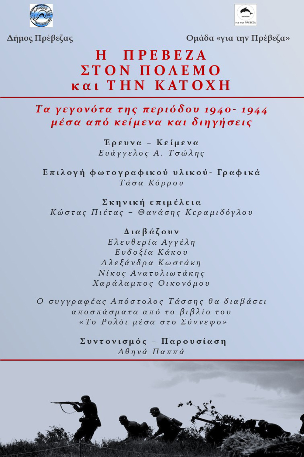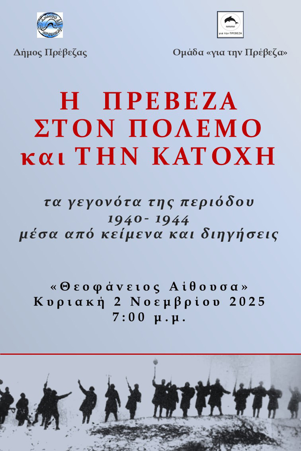 O Δήμος Πρέβεζας και η Ομάδα «για την ΠΡΕΒΕΖΑ» στο πλαίσιο των εορταστικών εκδηλώσεων για την 28η Οκτωβρίου 1940 διοργανώνουν την εκδήλωση «Η ΠΡΕΒΕΖΑ ΣΤΟΝ ΠΟΛΕΜΟ ΚΑΙ ΤΗΝ ΚΑΤΟΧΗ». Σε αυτή την εκδήλωση τα γεγονότα του Έπους του Σαράντα και της περιόδου της Κατοχής ξεδιπλώνονται μέσα από προφορικές μαρτυρίες και γραπτά κείμενα. Με σκοπό να τιμηθούν οι άνθρωποι, που βίωσαν τα γεγονότα, παρουσιάζονται συνεντεύξεις, γραπτά ντοκουμέντα, κείμενα από ιστορικές περιγραφές, ημερολόγια, λογοτεχνικά έργα και φωτογραφίες σε μια εξιστόρηση των γεγονότων, όπως την έζησαν οι ίδιοι οι Πρεβεζάνοι και οι κάτοικοι της ευρύτερης περιοχής.