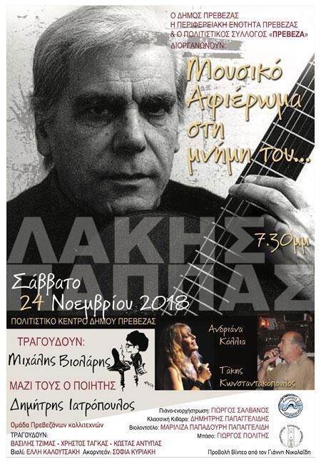 Σε μια ιδιαίτερη μουσική συνάντηση που θα πραγματοποιηθεί το Σάββατο 24 Νοεμβρίου και ώρα 7.30 μ.μ στο Πολιτιστικό Κέντρο (πρώην ΟΑΣΗ) η πόλη της Πρέβεζας θα τιμήσει τον δικό της Λάκη Παππά.