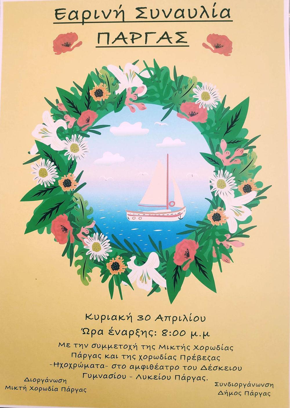 Η χορωδία Πρέβεζας «ΗΧΟΧΡΩΜΑΤΑ», ανταποκρινόμενη σε πρόσκληση της «Μικτής Χορωδίας Πάργας», θα συμμετέχει στην «ΕΑΡΙΝΗ ΣΥΝΑΥΛΙΑ ΠΑΡΓΑΣ», η οποία θα πραγματοποιηθεί την Κυριακή 30 Απριλίου 2023 στις 8:00 μ.μ. στο Αμφιθέατρο του Δέσκειου Γυμνασίου – Λυκείου Πάργας. Τα «ΗΧΟΧΡΩΜΑΤΑ» προσκαλούν όλους τους φίλους της χορωδιακής μουσικής και του ελληνικού τραγουδιού στην Πάργα και στην «Εαρινή Συναυλία».