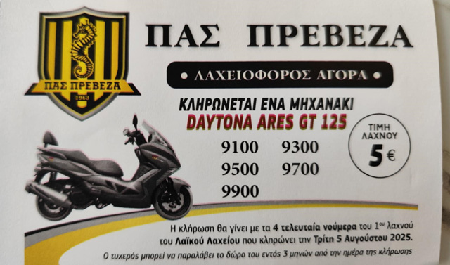 Κυκλοφόρησαν τα κουπόνια της λαχειοφόρου αγοράς του ΠΑΣ Πρέβεζα με δώρο ένα μηχανάκι DAYTONA ARES GT 125.