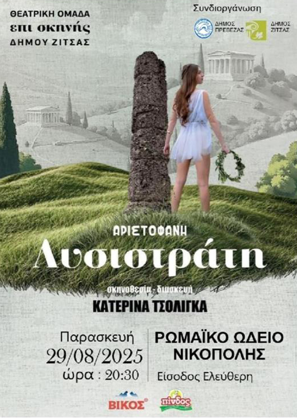 Η θεατρική ομάδα «ΕΠΙ ΣΚΗΝΗΣ» του Δήμου Ζίτσας θα παρουσιάσει την Παρασκευή, σε συνεργασία με το Δήμο Πρέβεζας στις 29 Αυγούστου, στις 20.30, στο Ρωμαϊκό Ωδείο της Νικόπολης την παράσταση «ΛΥΣΙΣΤΡΑΤΗ» του Αριστοφάνη, σε διασκευή και σκηνοθεσία της Κατερίνας Τσολίγκα.