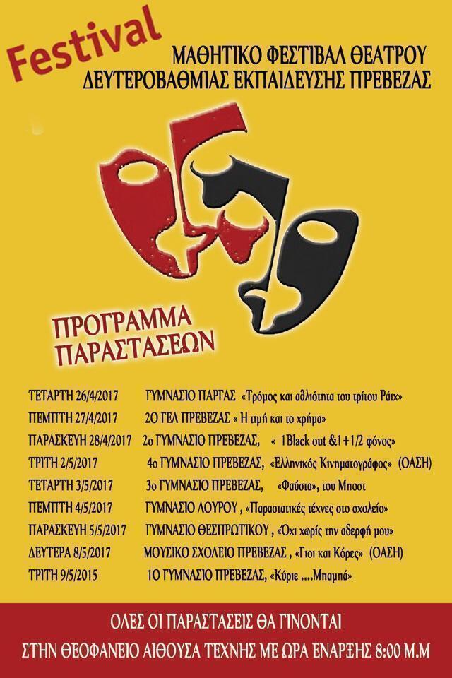 Για 5η συνεχόμενη χρονιά η Δευτεροβάθμια Εκπαίδευση Πρέβεζας θα πραγματοποιήσει το Μαθητικό Φεστιβάλ Θεάτρου, από την Τετάρτη 26 Απριλίου έως και την Τρίτη 9 Μαϊου.