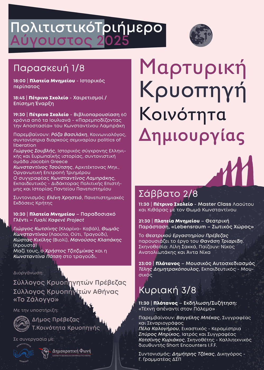 Ένα ορεινό χωριό της Πρέβεζας με μεγάλη ιστορία, η Κρυοπηγή συνεχίζει να δημιουργεί! Μέσα από την τέχνη στις διαφορετικές μορφές της, επανασυνδεόμαστε με τις βαθιές πληγές που άφησε στον τόπο ο 2ος Παγκόσμιος πόλεμος, με τη δύναμη των ανθρώπων που αντιστάθηκαν στη ναζιστική θηριωδία και κρατήθηκαν όρθιοι. Μέσα από συλλογικές προσπάθειες και πολιτιστικές πρωτοβουλίες, η Κρυοπηγή αναδεικνύεται ξανά ως τόπος ζωής, στοχασμού, κοινότητα δημιουργίας!