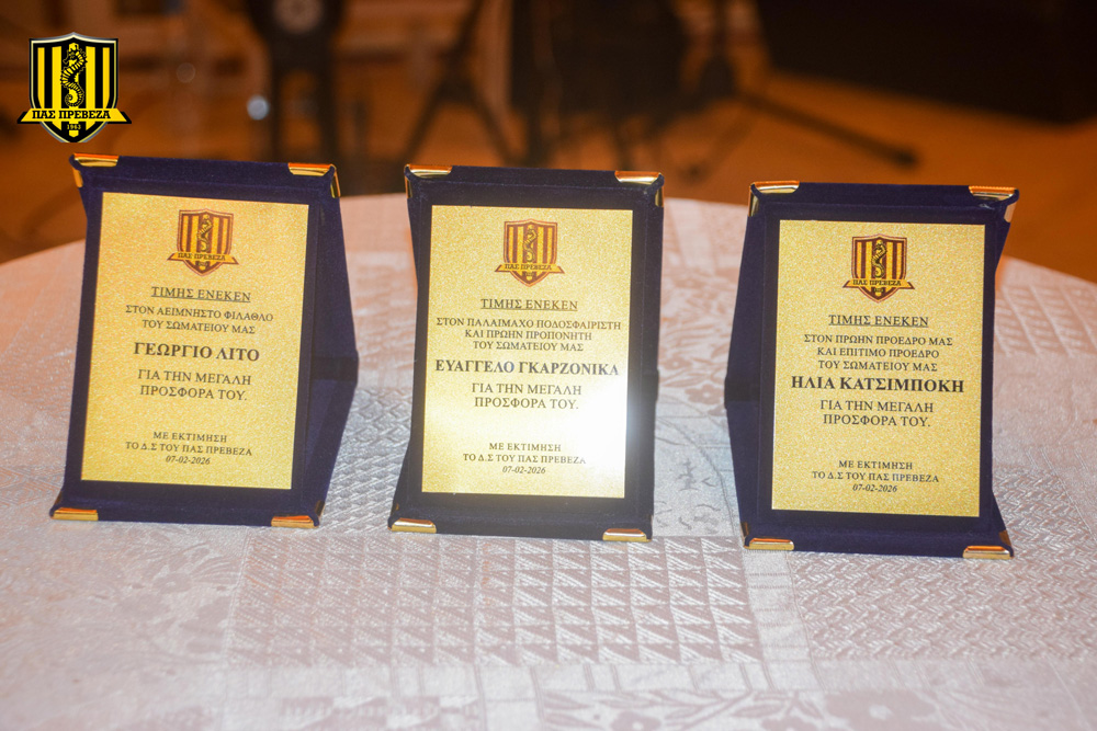 Η πιο δυνατή στιγμή της εκδήλωσης ήρθε με τις τιμητικές βραβεύσεις ανθρώπων που άφησαν ανεξίτηλο το αποτύπωμά τους στην ιστορία του ΠΑΣ Πρέβεζα. Ο πρώην πρόεδρος Ηλίας Κατσιμπόκης και ο πρώην ποδοσφαιριστής και προπονητής Βαγγέλης Γκαρτζονίκας τιμήθηκαν για την πολυετή προσφορά τους, παρότι δεν μπόρεσαν να παρευρεθούν λόγω προβλημάτων υγείας. Ιδιαίτερη συγκίνηση προκάλεσε η βράβευση του αείμνηστου φιλάθλου Γιώργου Λίτου (Πέπε), με την τιμητική πλακέτα να παραλαμβάνεται από τον γιο του Κώστα, σε μια στιγμή που «λύγισε» το κοινό και υπενθύμισε πως ο ΠΑΣ είναι και οι άνθρωποί του.