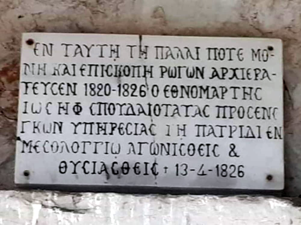 Δίπλα στην είσοδο του Ιερού Ναού υπάρχει επιγραφή που αναγράφει: «ΕΝ ΤΑΥΤΗ ΤΗΝ ΠΑΛΑΙ ΜΟΝΗ ΚΑΙ ΕΠΙΣΚΟΠΗ ΡΩΓΩΝ ΑΡΧΙΕΡΑΤΕΥΣΕ 1820-1826 Ο ΕΘΝΟΜΑΡΤΥΡΑΣ ΙΩΣΗΦ ΣΠΟΥΔΑΙΟΤΑΤΑΣ ΠΡΟΣΕΝΕΓΚΩΝ ΥΠΗΡΕΣΙΑΣ ΤΗ ΠΑΤΡΙΔΙ ΕΝ ΜΕΣΟΛΟΓΓΙΩ ΑΓΩΝΙΣΘΕΙΣ ΚΑΙ ΘΥΣΑΣΘΕΙΣ 13/04/1826».