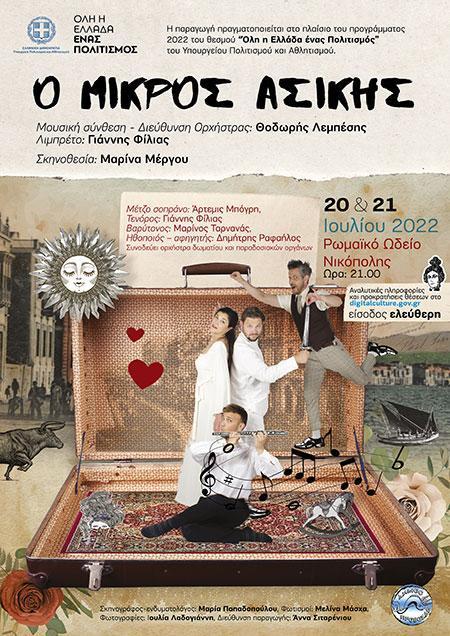 Η παιδική όπερα “Ο Μικρός Ασίκης” θα παρουσιαστεί στις 20 και 21 Ιουλίου στο Ρωμαϊκό Ωδείο της Νικόπολης στο πλαίοιο του προγράμματος του Υπουργείου Πολιτισμού “Ολη η Ελλάδα ένας Πολιτισμός” με συνδιοργανωτές τον Δήμο και την Εφορεία Αρχαιοτήτων Πρέβεζας.