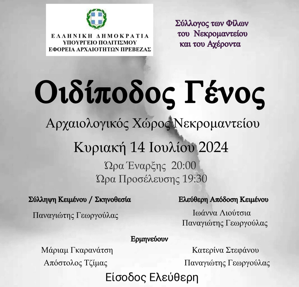 Μια performance με συρραφή αποσπασμάτων από τα έργα των Σοφοκλή, Αισχύλου και Ευριπίδη, η οποία εξιστορεί την τραγική πορεία της γενιάς του Οιδίποδα παρουσιάζει το Θεατρικό Σχήμα ΑΩ σε συνεργασία με την Εφορεία Αρχαιοτήτων Πρέβεζας και τον Σύλλογο " Σύλλογος των Φίλων του Νεκρομαντείου και του Αχέροντα " την Κυριακή 14 Ιουλίου και ώρα έναρξης 20:00 (ώρα προσέλευσης 19:30) στον Αρχαιολογικό Χώρο του Νεκρομαντείου με ελεύθερη είσοδο για το κοινό