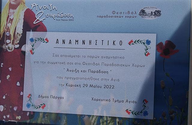 Ολοκληρώθηκε με επιτυχία το 1ο Φεστιβάλ Παραδοσιακών Χορών «Άνοιξη και παράδοση» που διοργανώθηκε στην Αγιά από τον Δήμο Πάργας σε συνεργασία με το Χορευτικό Τμήμα Αγιάς. Στην εκδήλωση συμμετείχαν τα Χορευτικά Τμήματα Αγιάς και Πάργας, ο Επιμορφωτικός και Ψυχαγωγικός Σύλλογος «ΑΧΕΡΩΝ», ο Πολιτιστικός Σύλλογος Πέρδικας και ο Πολιτιστικός Σύλλογος Νέας Σελεύκειας.