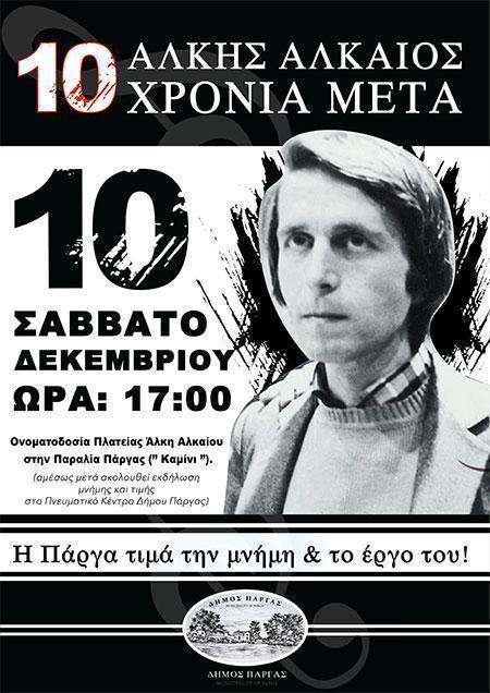 Ο Δήμος Πάργας τιμώντας την μνήμη και το έργο του ποιητή και στιχουργού Άλκη Αλκαίου, θα ονοματοδοτήσει την Πλατεία «Αλκης Αλκαίος», 10 χρόνια μετά τον θάνατό του. Η ονοματοδοσία θα γίνει το Σάββατο 10 Δεκεμβρίου στις 17.00 στην παραλία της Πάργας (θέση «Καμίνι») και αμέσως μετά θα ακολουθήσει εκδήλωση για το έργο του ποιητή στο Πνευματικό Κέντρο Δήμου Πάργας.