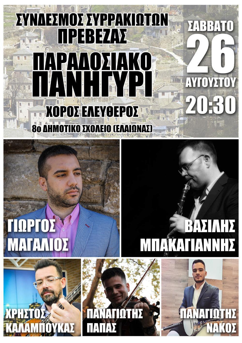 Ο Πρόεδρος και το Διοικητικό Συμβούλιο του Συνδέσμου Συρρακιωτών Πρέβεζας σας προσκαλούμε στο παραδοσιακό Πανηγύρι που διοργανώνουμε το Σάββατο 26 Αυγούστου 2023, με ώρα προσέλευσης 20:30 στον προαύλιο χώρο του 8ου Δημοτικού Σχολείου Πρέβεζας (Ελαιώνα). Σας περιμένουμε σε ένα παραδοσιακό γλέντι με δροσερά ποτά, καλό φαγητό και πολύ χορό.