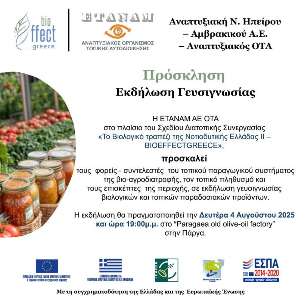 Εκδήλωση γευσιγνωσίας βιολογικών και τοπικών παραδοσιακών προϊόντων, θα πραγματοποιηθεί την Δευτέρα, 4 Αυγούστου 2025 και ώρα 19:00 στο "Paragaea old olive-oil factory" στην Πάργα. Η εκδήλωση που διοργανώνει η ΕΤΑΝΑΜ ΑΕ ΟΤΑ θα γίνει στο πλαίσιο του Σχεδίου Διατοπικής Συνεργασίας «Το Βιολογικό τραπέζι της Νοτιοδυτικής Ελλάδας ΙΙ-BIOEFFECTGREECE», του Προγράμματος "Αγροτικής Ανάπτυξης της Ελλάδας 2014 -2020" (ΠΑΑ), Μέτρο 19, Υπομέτρο 19.3 - Διατοπική και Διακρατική Συνεργασία.