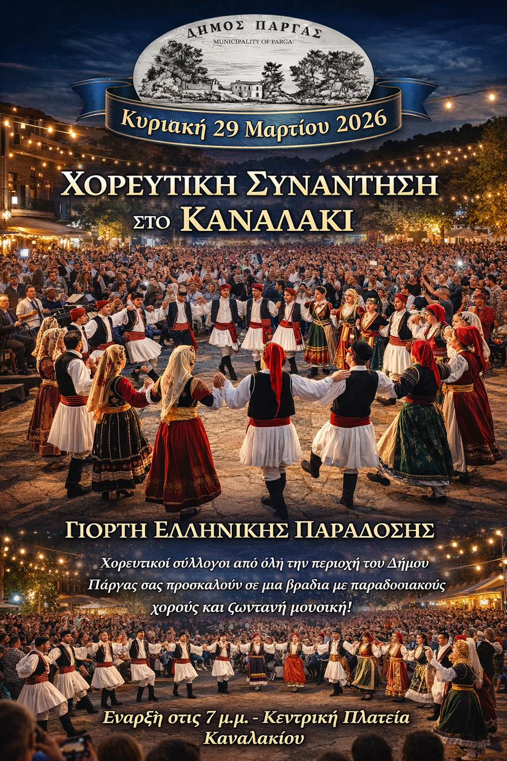 Ο Δήμος Πάργας διοργανώνει την Κυριακή 29 Μαρτίου 2026 στις 7:00μ.μ. χορευτική συνάντηση στην κεντρική πλατεία του Καναλάκι, με τη συμμετοχή χορευτικών συλλόγων από όλη την περιοχή του Δήμου.