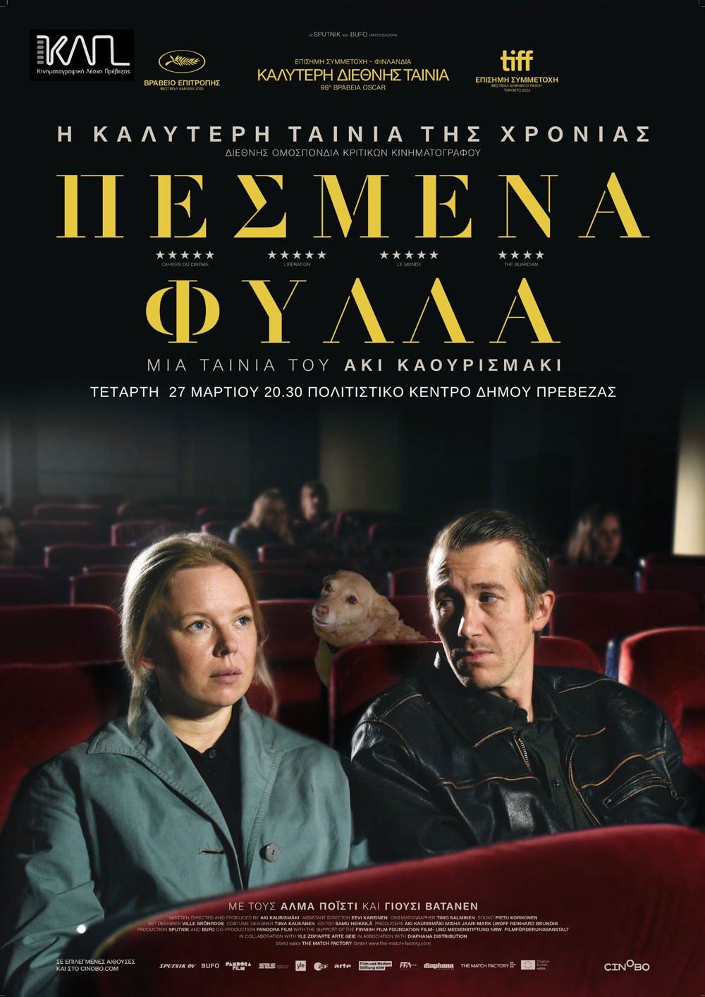 Η Κινηματογραφική Λέσχη Πρέβεζας πιστή στην προβολή ταινιών με κινηματογραφικό χαρακτήρα και αισθητική, προβάλει την ταινία «Πεσμένα Φύλλα» του Άκι Καουρισμάκι την Τετάρτη 27 Μαρτίου στις 20.30 στο Πολιτιστικό Κέντρο Πρέβεζας με εισιτήριο 4 ευρώ για φοιτητές, 6 ευρώ γενική είσοδο, και δωρεάν είσοδο για μαθητές και ανέργους.