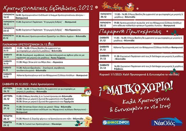 26/12/22: Ώρα 11.00: Ο Άη Βασίλης στο ‘Μαγικό Χωριό’ θα υποδεχτεί τον Μάγο Καπελά ο οποίος με τη βοήθεια του ξωτικού θα κάνει διασκεδαστικά και ανεξήγητα μαγικά κόλπα. – Φιλιππιάδα, Ώρα: 11:30.