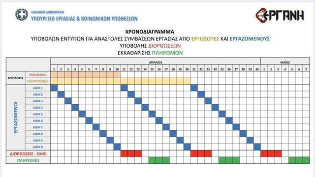 Όπως αναφέρει, ο πίνακας με το χρονοδιάγραμμα υλοποίησης αφορά την υποβολή εντύπων επιχειρήσεων και εργαζομένων, με βάση το ΑΦΜ, τους χρόνους διορθώσεων και τους χρόνους καταβολής των 800 ευρώ (σε τρεις φάσεις).