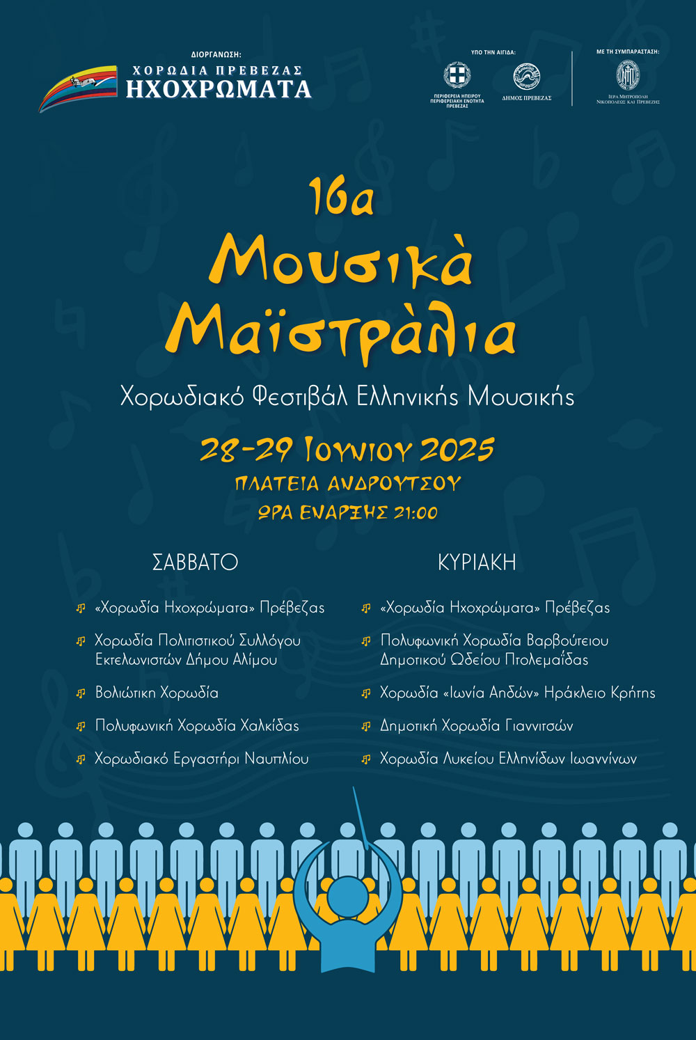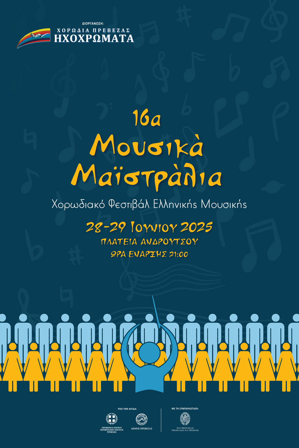 Το Σάββατο 28 και Κυριακή 29 Ιουνίου 2025 η «ΧΟΡΩΔΙΑ ΗΧΟΧΡΩΜΑΤΑ» ΠΡΕΒΕΖΑΣ διοργανώνει το Χορωδιακό Φεστιβάλ Ελληνικής Μουσικής «16α ΜΟΥΣΙΚΑ ΜΑΙΣΤΡΑΛΙΑ». υπό την αιγίδα της Περιφέρειας Ηπείρου, του Δήμου Πρέβεζας και την υποστήριξη της Ιεράς Μητροπόλεως Νικοπόλεως και Πρεβέζης,