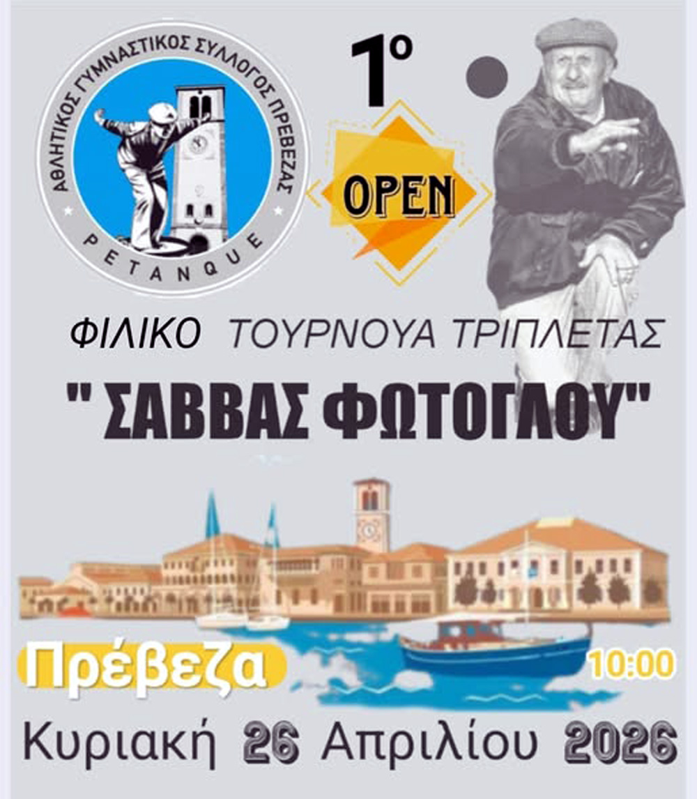 Ο Αθλητικός Γυμναστικός Σύλλογος Πρέβεζας, τιμώντας τη μνήμη του ΣΑΒΒΑ ΦΩΤΟΓΛΟΥ διοργανώνει το 1ο Φιλικό Τουρνουά Τριπλέτας, την Κυριακή 26 Απριλίου 2026, στις 10:00 το πρωί, στα γήπεδα της Κυανής Ακτής.