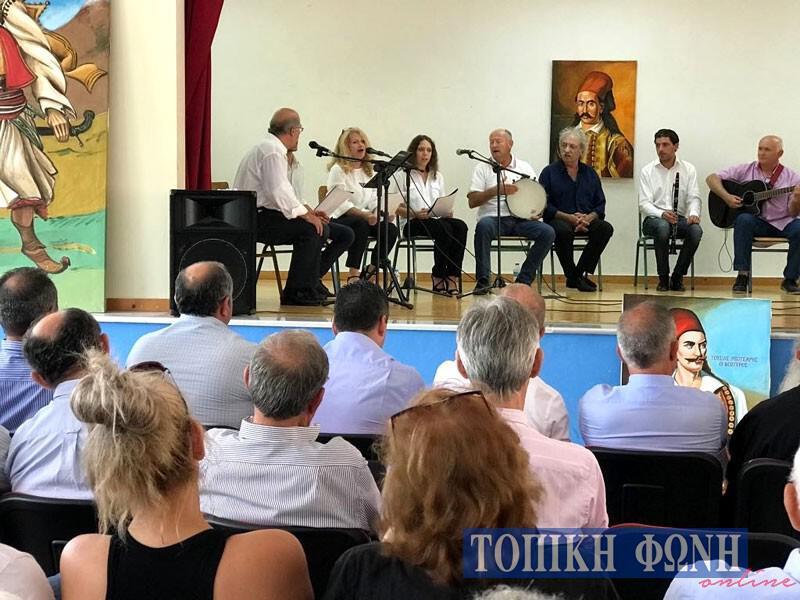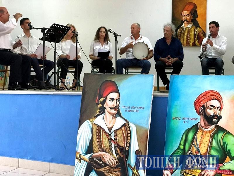 Για την εκδήλωση γενικότερα, οι ομιλίες διανθίζονταν από απαγγελίες ποιημάτων αλλά και τραγούδια στα οποία κυριαρχούσε ο μεγάλος ήρωας. Η Μουσική Εισαγωγή, Μοιρολόϊ στο Μάρκο Μπότσαρη από τον Απόστολο Καλδάνη ήταν συγκλονιστική. Το ίδιο συγκλονιστική η απαγγελία της Ωδής «Εις Μάρκον Μπότσαρην» του Διονυσίου Σολωμού από τη φιλόλογο Αντιγόνη Δήμα, ενώ μας εξέπληξε ευχάριστα η Χορωδία του Συλλόγου με επικεφαλής την φίλη και συνεργάτιδα της Τ.Φ Αλίκης Νάσση, στο πρώτο τραγούδι «Τόμαθες, μωρ’ δόλια μάνα».
