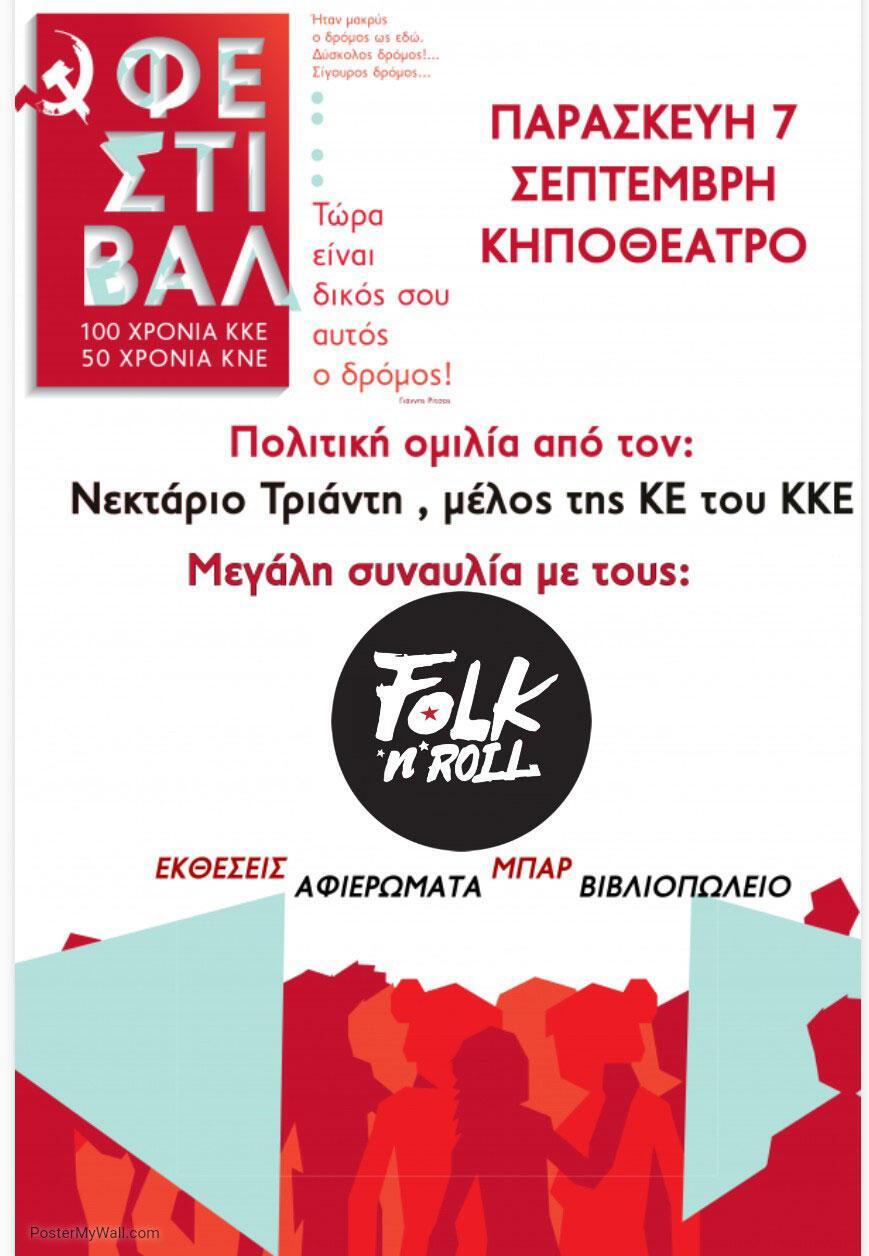 Πολιτική ομιλία από το Νεκτάριο Τριάντη, μέλος της ΚΕ του ΚΚΕ καθώς και Μεγάλη συναυλία από το συγκρότημα Folk n’ roll