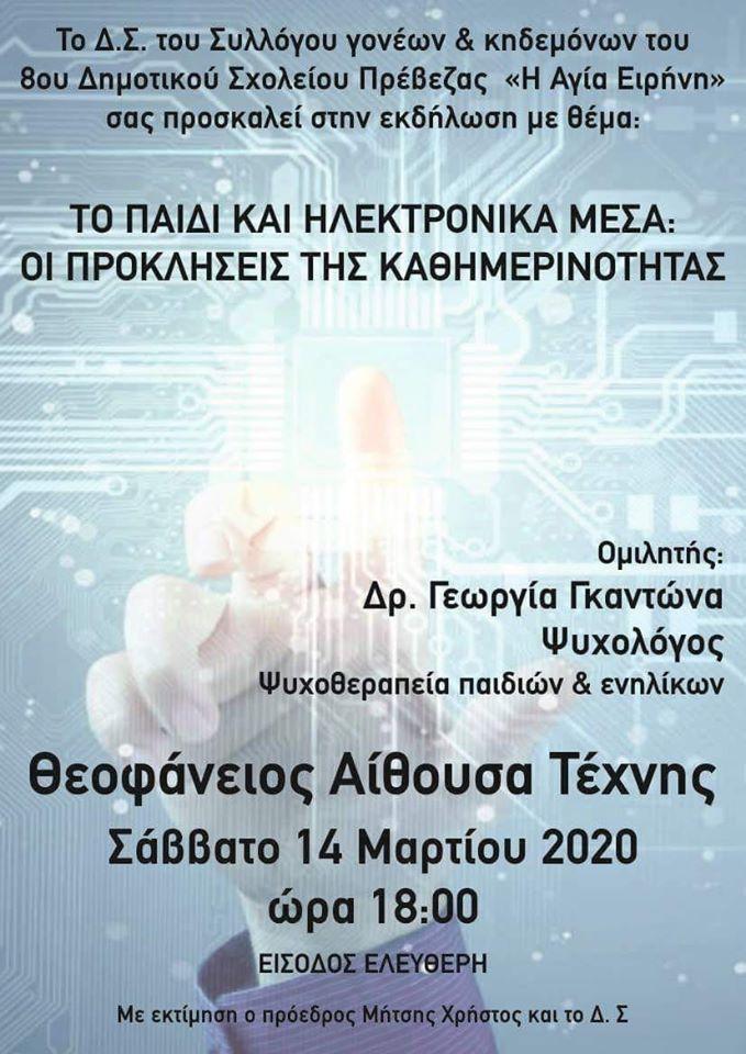 «Το παιδί και ηλεκτρονικά μέσα: Oι προκλήσεις της καθημερινότητας» είναι το θέμα της εκδήλωσης που διοργανώνει ο Σύλλογος Γονέων & Κηδεμόνων του 8ου Δημοτικού Σχολείου Πρέβεζας το Σάββατο 14 Μαρτίου στις 6 μ.μ., στην αίθουσα της Θεοφανείου.