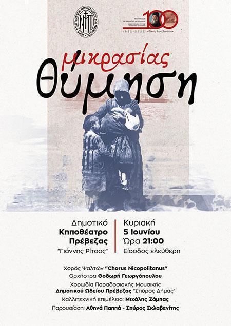 Τήν Κυριακή, 5 Ἰουνίου 2022 καί ὥρα 9μ.μ. στό Δημοτικό Κηποθέατρο «Γιάννης Ρίτσος», ἡ Ἱερά Σύνοδος τῆς Ἐκκλησίας τῆς Ἑλλάδος μέ φορέα τήν Ἱερά Μητρόπολή μας στά πλαίσια τῶν Περιφερειακῶν Ἐπετειακῶν Ἐκδηλώσεων γιά τά 100 χρόνια ἀπό τήν Μικρασιατική Καταστροφή (1922-2022) θά πραγματοποιήσει Μουσική Ἐκδήλωση μέ τίτλο «ΜΙΚΡΑΣΙΑΣ ΘΥΜΗΣΗ - ΜΟΥΣΙΚΗ ΠΕΡΙΔΙΑΒΑΣΗ ΣΤΑ ΜΟΝΟΠΑΤΙΑ ΤΗΣ ΕΛΛΗΝΙΚΗΣ ΑΝΑΤΟΛΗΣ».