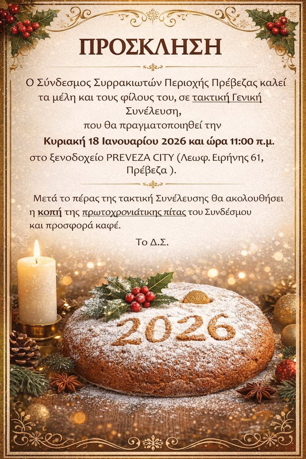 Ο Σύνδεσμος Συρρακιωτών Περιοχής Πρέβεζας, καλεί τα μέλη και τους φίλους του, σε τακτική Γενική Συνέλευση, που θα πραγματοποιηθεί την Κυριακή 18 Ιανουαρίου 2026 και ώρα 11:00 π.μ, στο ξενοδοχείο PREVEZA CITY (Λεωφ. Ειρήνης 61, Πρέβεζα), με θέματα ημερήσιας διάταξης: