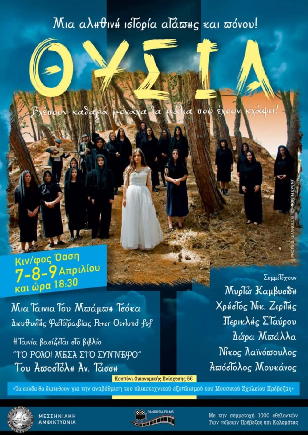 Στις 7-8 και 9 Απριλίου η ταινία του Μπάμπη Τσόκα «Θυσία» προβάλλεται ξανά στο Πολιτιστικό Κέντρο του Δήμου Πρέβεζας (Όαση). Επιθυμία του συμπολίτη μας σκηνοθέτη είναι τα έσοδα από τις προβολές της ταινίας να διατεθούν στο Μουσικό Σχολείο Πρέβεζας για την αναβάθμιση του υλικοτεχνικού εξοπλισμού του. Για το λόγο αυτό θα διατίθενται κουπόνια οικονομικής ενίσχυσης (5 ευρώ).