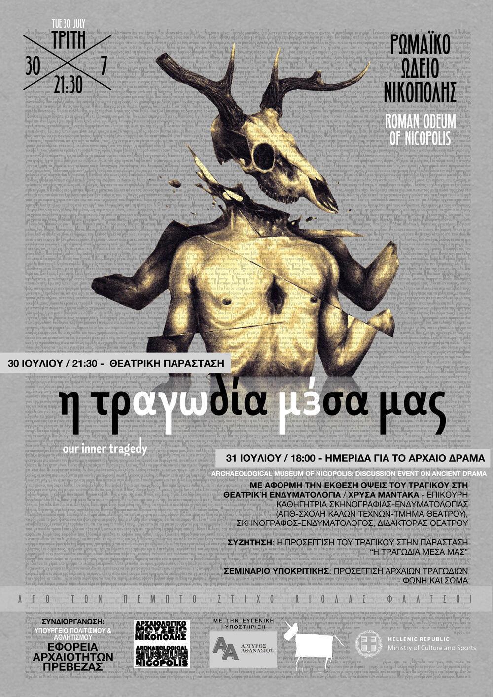 Η Πειραματική Ομάδα Θεάτρου “Από τον πέμπτο στίχο κιόλας Φάλτσοι” και η Εφορεία Αρχαιοτήτων Πρέβεζας παρουσιάζουν στο Ρωμαϊκό Ωδείο Νικόπολης την Τρίτη 30 Ιουλίου 2019, 21.30 την παράσταση «Η τραγωδία μέσα μας». Μετά την άκρως επιτυχημένη παρουσίασή της στο πλαίσιο του SKG Bridges Festival, τον Μάιο στη Θεσσαλονίκη, τo Ρωμαϊκό Ωδείο Νικόπολης αποτελεί τον τρίτο σταθμό στην περιοδεία της παράστασης, όπου παρουσιάζεται σε συνδιοργάνωση με την Εφορεία Αρχαιοτήτων Πρέβεζας.