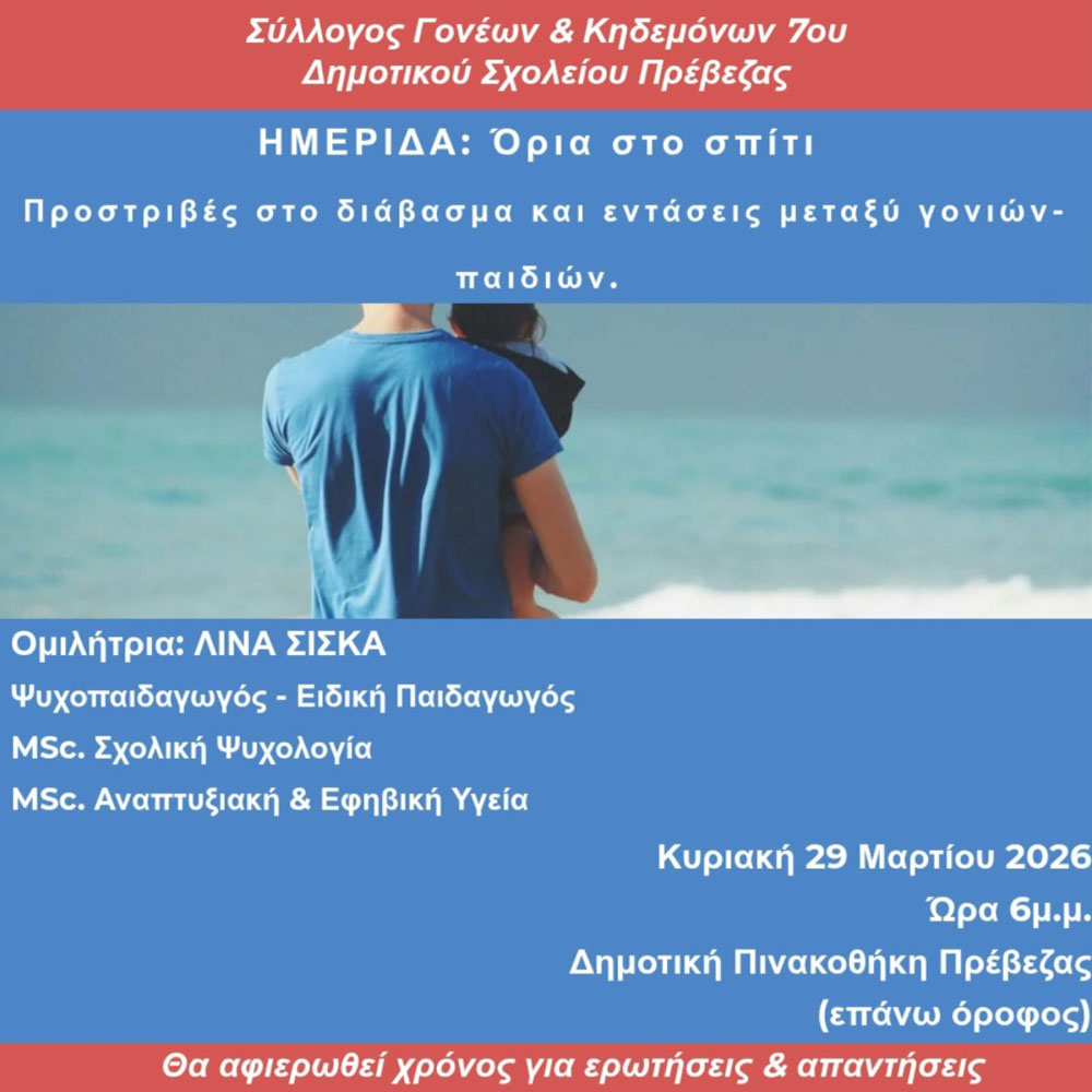 Ο Σύλλογος Γονέων και Κηδεμόνων του 7ου Δημοτικού Σχολείου Πρέβεζας θα πραγματοποιήσει την Κυριακή 29 Μαρτίου, στις 6μ.μ. στη Δημοτική Πινακοθήκη Πρέβεζας (επάνω όροφος) ημερίδα με θέμα: “Όρια στο σπίτι-Προστριβές στο διάβασμα και εντάσεις μεταξύ γονιών-παιδιών”.