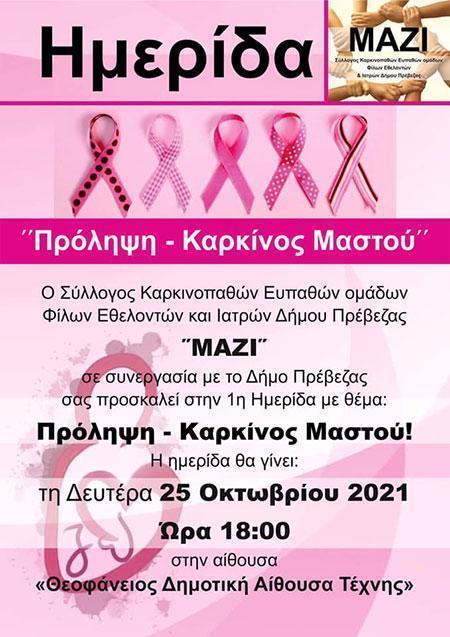 Ο Σύλλογος Καρκινοπαθών Ευπαθών ομάδων φίλων εθελοντών και ιατρών Δήμου Πρέβεζας «Μαζί» σε συνεργασία με το Δήμο της Πρέβεζας διοργανώνουμε την 1η ημερίδα με θέμα: Πρόληψη – Καρκίνος Μαστού, τη Δευτέρα 25 Οκτωβρίου στις 6 το απόγευμα στην αίθουσα «Θεοφάνειος Δημοτική Αίθουσα Τέχνης».