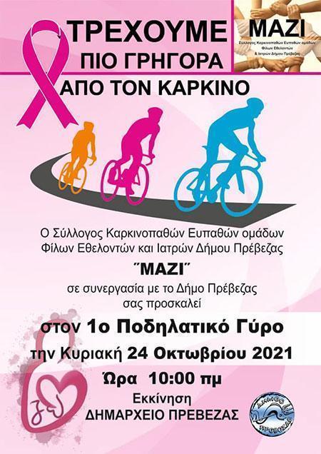 Μία μέρα νωρίτερα την Κυριακή 24 Οκτωβρίου ο σύλλογος "Μαζί" σε συνεργασία με το Δήμο της Πρέβεζας διοργανώνουν το 1ο Ποδηλατικό Γύρο με σύνθημα «Τρέχουμε πιο γρήγορα από τον Καρκίνο» στις 10 το πρωί με εκκίνηση το δημαρχείο Πρέβεζας.