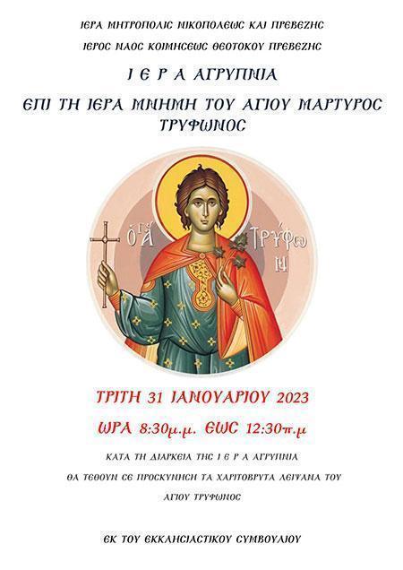 Ιερά Αγρυπνία επί τη Ιερά μνήμη του Αγίου Μαρτυρος Τρύφωνος θα πραγματοποιηθεί την Τρίτη 31 Ιανουαρίου 2023 και ώρα 8.30 μ.μ. έως 12.30 π.μ. στον Ιερό Ναό Κοιμήσεως της Θεοτόκου.