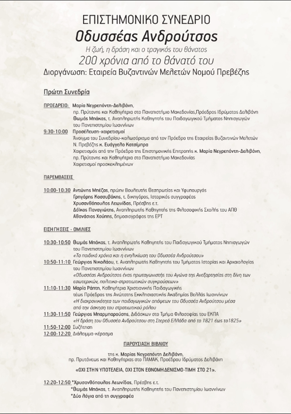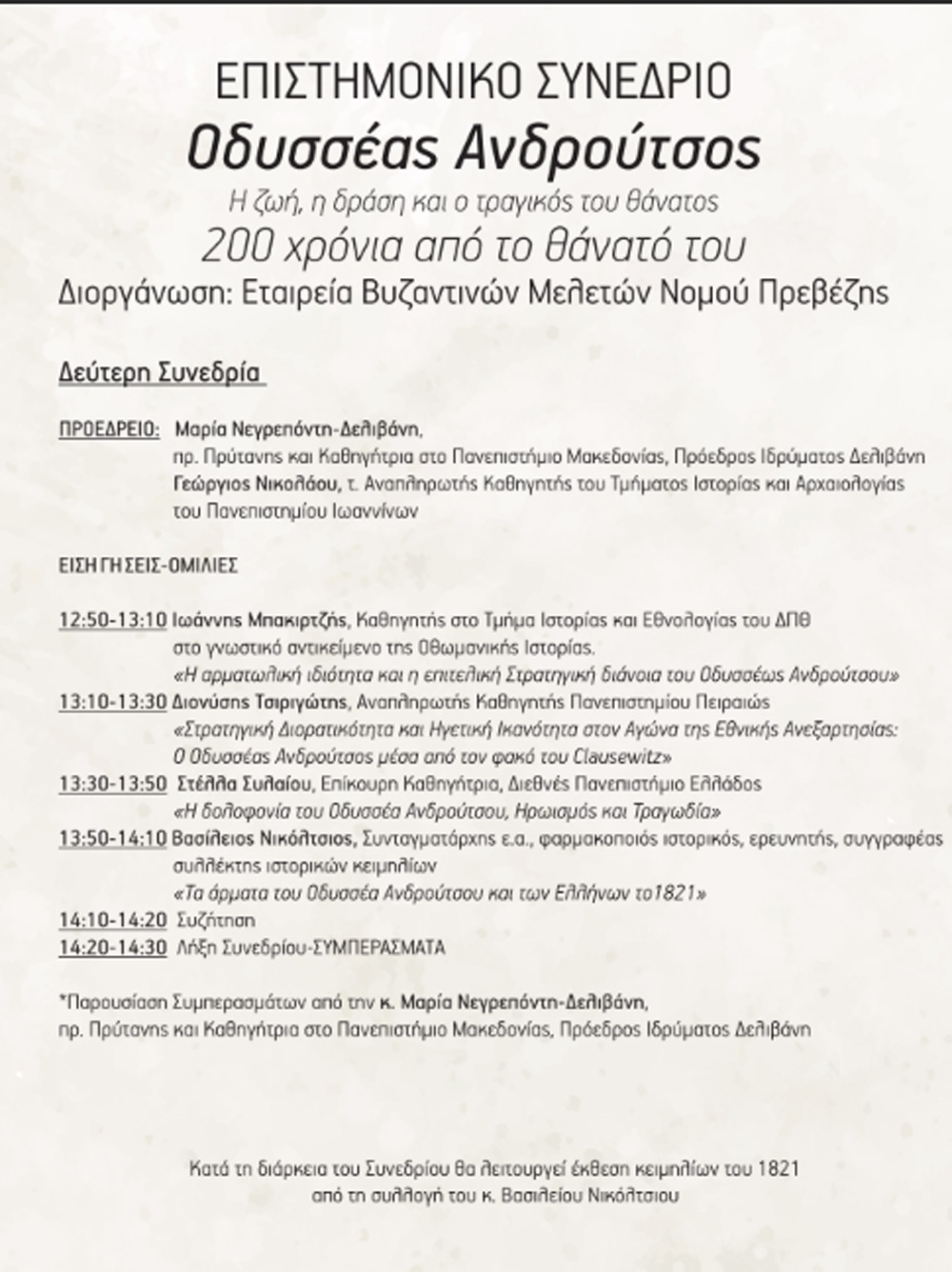 Μετά από τις άοκνες προσπάθειές μας, αρκετών μηνών, να επιτύχουμε ότι καλύτερο γίνεται, φτάσαμε στο τέλος και θέλουμε να πιστεύουμε ότι το Συνέδριο για τον Οδυσσέα Ανδρούτσο θα έχει την επιτυχία που αξίζει και θα συμβάλει στην αποκατάσταση της μνήμης του.